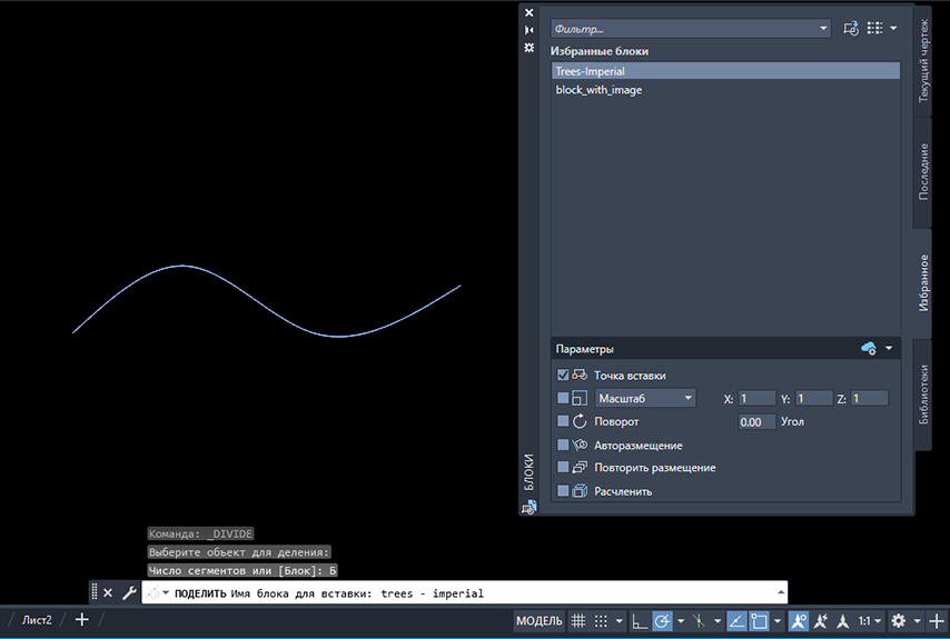 Ранее вы размещали точки на объектах с помощью команд ПОДЕЛИТЬ и РАЗМЕТИТЬ, однако можно также использовать параметр «Блок» для размещения блоков по длине или периметру объекта. В следующем примере команда ПОДЕЛИТЬ используется для размещения пяти равномерно распределенных блоков (в данном случае деревьев) вдоль сплайна.