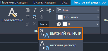 На контекстной вкладке ленты «Текстовый редактор» на панели «Инструменты» выберите «Все ПРОПИСНЫЕ».