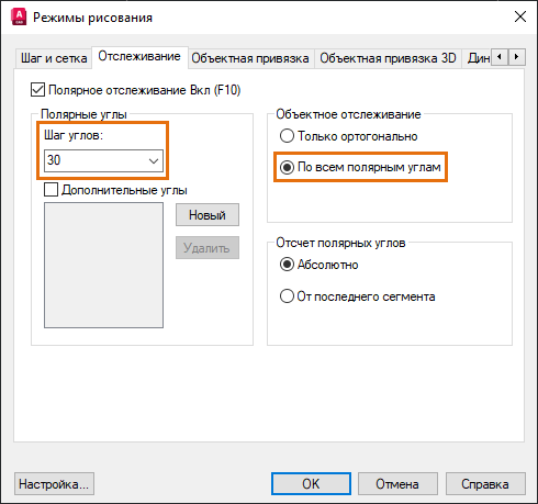 2. В диалоговом окне «Режимы рисования» в области «Полярное отслеживание» задайте для угла приращения значение 30 градусов.