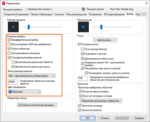 Предварительный выбор (PICKFIRST). Если требуется выбирать объекты, сначала убедитесь, что этот флажок установлен, а затем выберите команду для работы с набором объектов.