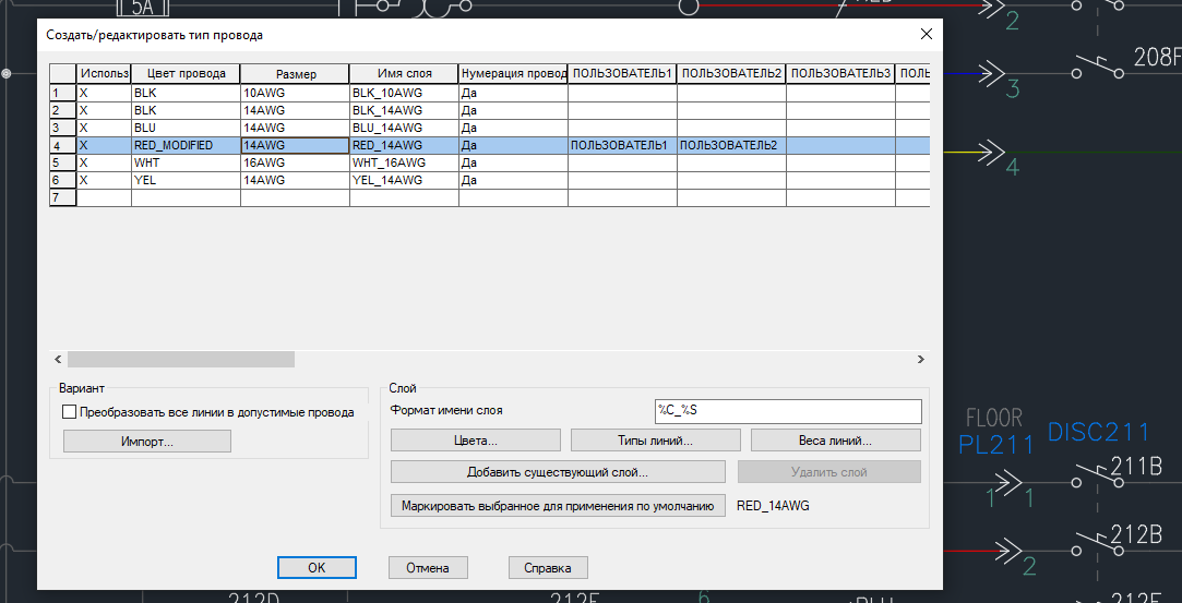 панель «Редактировать провода/номера проводов»
