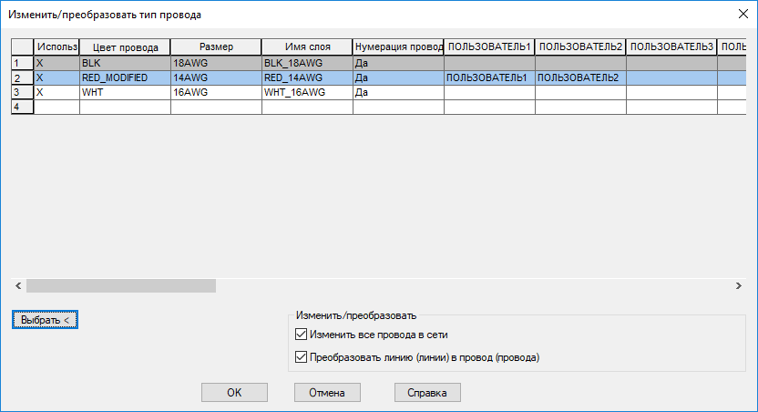 раскрывающийся список «Изменить тип провода»