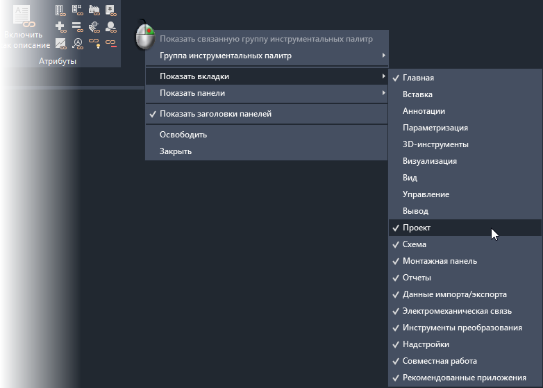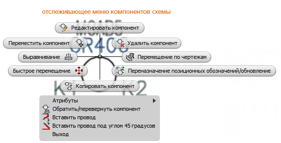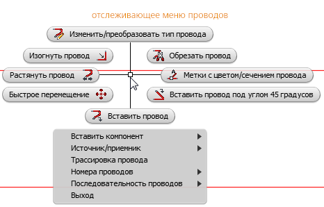 Убедитесь в том, что текущим рабочим пространством является "AcadE и 2D рисование и аннотации". Отслеживающее меню представляет собой радиальное контекстное меню. Наведите курсор на объект электрической системы и щелкните правой кнопкой мыши. Доступные параметры в меню зависят от типа объекта, на который наведен курсор.
