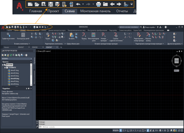 Все функции, описанные в данном руководстве, можно вызвать с помощью ленты. Кроме того, на панели быстрого доступа, показанной на иллюстрации, содержатся некоторые навигационные команды, используемые в Инструментарий AutoCAD Electrical.