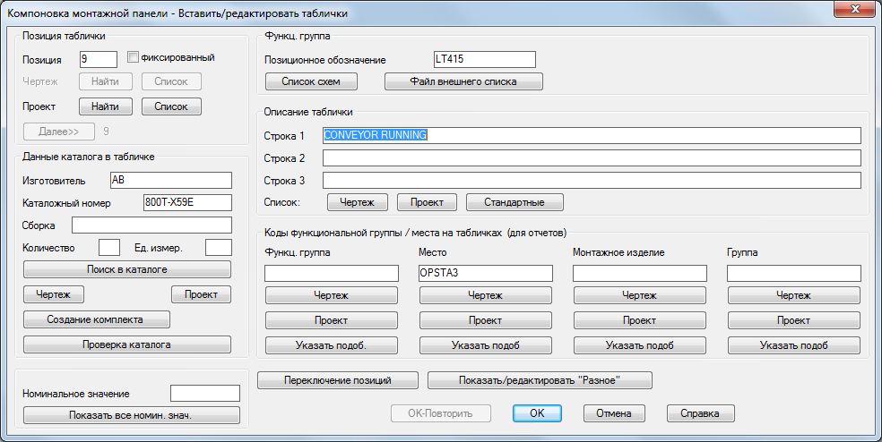 При вставке таблички ее можно связать с компоновочным образом монтажной панели. При этом из компоновочного образа копируются следующие значения: позиционное обозначение, функциональная группа, место и описания. Также можно назначить позицию и значение по каталогу, относящиеся к конкретной табличке.