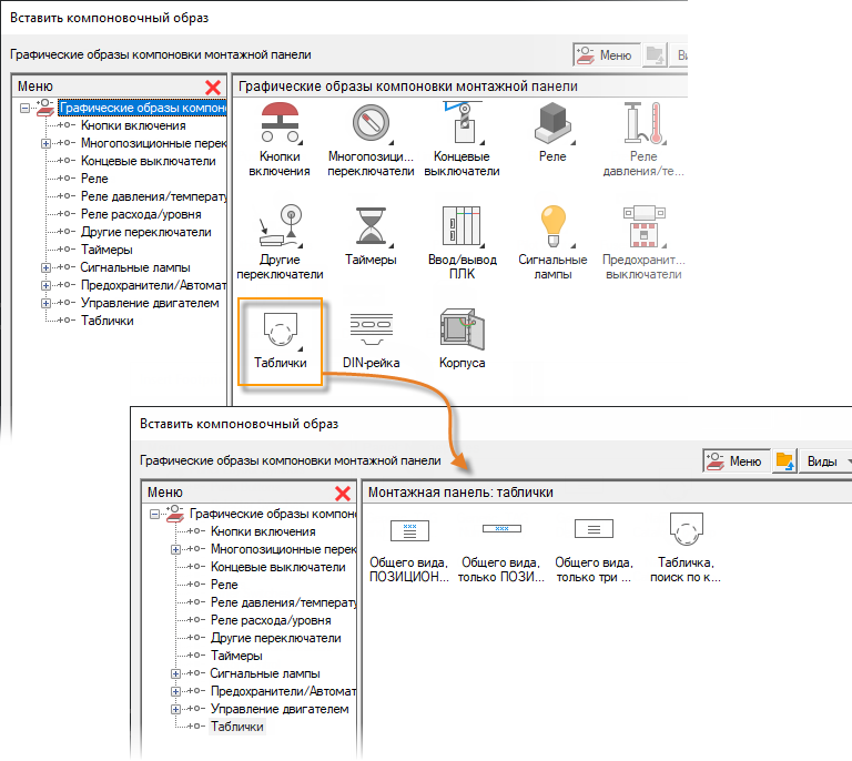 Для вставки табличек следует использовать графическое меню монтажной панели.