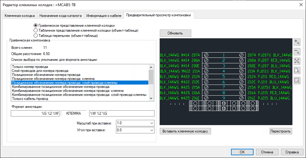 Для вставки клеммной колодки используйте вкладку "Предварительный просмотр компоновки". При этом можно выбрать ее тип и стиль аннотации. Используйте окно предварительного просмотра, чтобы убедиться в том, что все параметры настроены необходимым образом.