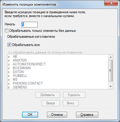 Позиции можно назначать как для монтажной панели, так и для графических образов схемы. При назначении для компонента значения по каталогу программа проверяет, была ли позиция назначена для этого значения по каталогу в другом компоненте. Если это так, то позиция назначается автоматически. Если позиция не назначена автоматически, это можно сделать при редактировании компонента. Также позиции можно назначать в рамках проекта с помощью команды "Изменить последовательность позиций". найти