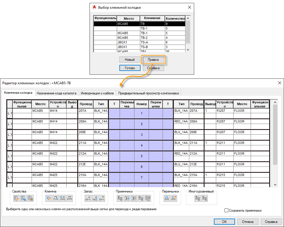 С помощью редактора клеммных колодок можно выполнять следующие действия: