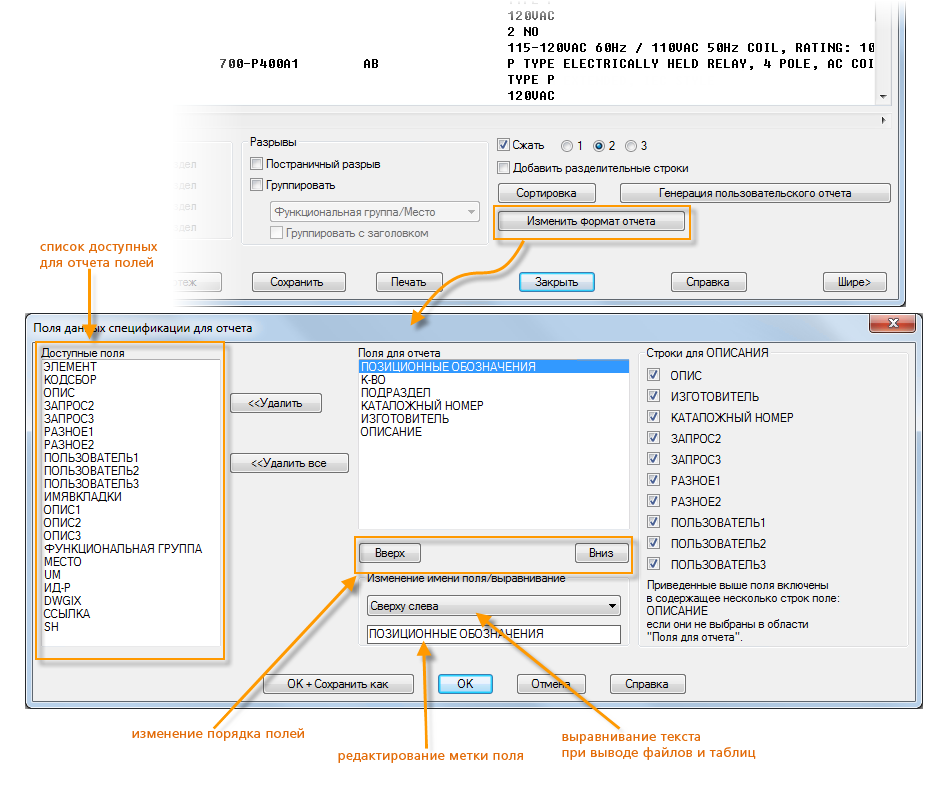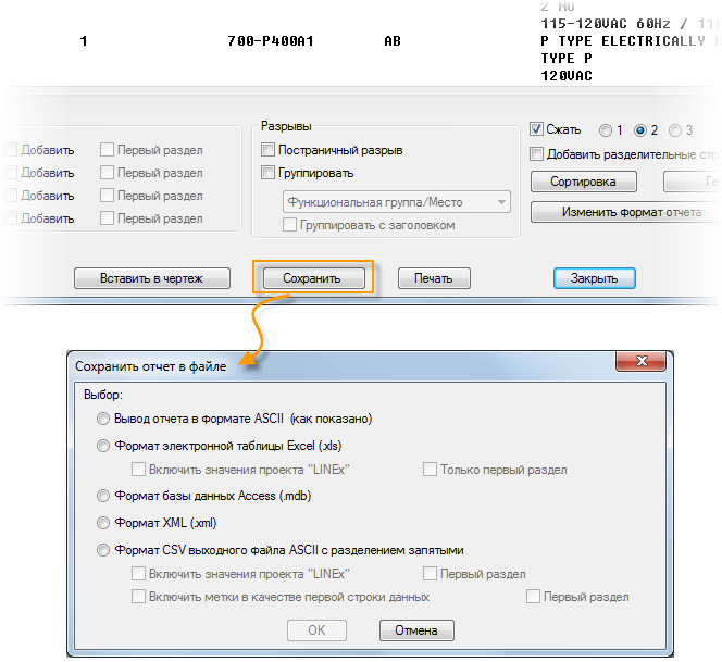 Создание и форматирование отчетов. Отчет можно выводить в файл или вставлять в качестве объекта таблицы на чертеже.