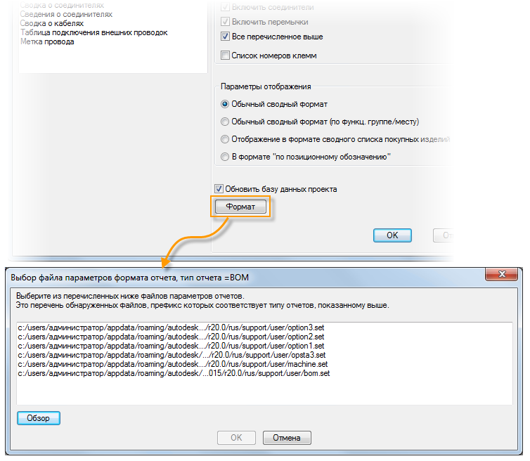 Каждый файл форматирования сохраняется с расширением SET. Чтобы использовать файл форматирования при создании отчета, в диалоговом окне отчета нужно нажать кнопку "Формат" и выбрать файл параметров отчета.