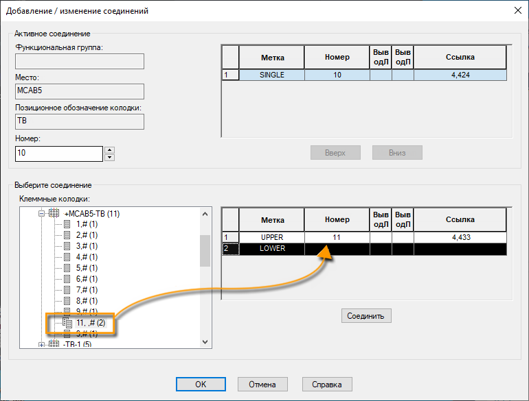 Если клеммы находятся на разных чертежах, нужно изменить клемму, которую требуется связать с другой. Нажмите кнопку "Добавить/Изменить", чтобы открыть диалоговое окно "Добавить/изменить соединения". Здесь можно переместить клемму на открытый уровень другой клеммы.