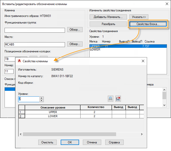 Графический образ клеммы на схеме может обозначать одноуровневую клемму или один уровень многоуровневой клеммы. Количество уровней для клеммы указывается как свойство блока. Каждый уровень содержит некоторые характеристики, такие как метка, количество проводов на соединение, левый вывод и правый вывод. Каждый графический образ клеммы на схеме содержит все свойства блока клемм для каждого уровня, так что удаление одного графического образа клеммы не приводит к удалению свойств блока клемм. При изменении свойства блока клемм выполняется обновление всех графических образов клемм. Графический образ без каких-либо свойств уровня рассматривается как одноуровневая клемма. Свойства клеммы могут быть частью назначения каталожного номера и применяются автоматически при назначении каталога.