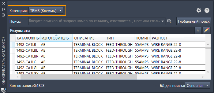 Вставка клемм осуществляется таким же образом, как и вставка других графических образов схем: из обозревателя каталогов или графического меню. При вставке из обозревателя каталогов необходимо выбрать категорию TRMS (клеммы).