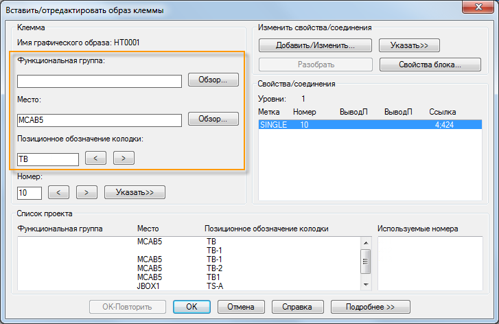 Для группировки клемм в одной клеммной колодке используются свойства "Функциональная группа", "Место" и "Позиционное обозначение колодки".