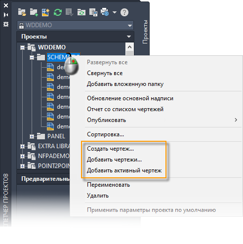 Существующие чертежи можно в любое время добавлять в активный проект. Эта функция полезна, если требуется повторное использование чертежей из предыдущего проекта. Чтобы добавить или создать чертежи в определенной папке, щелкните правой кнопкой мыши имя папки в Диспетчере проектов и выберите необходимое действие.