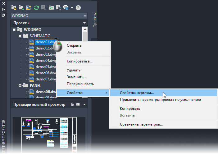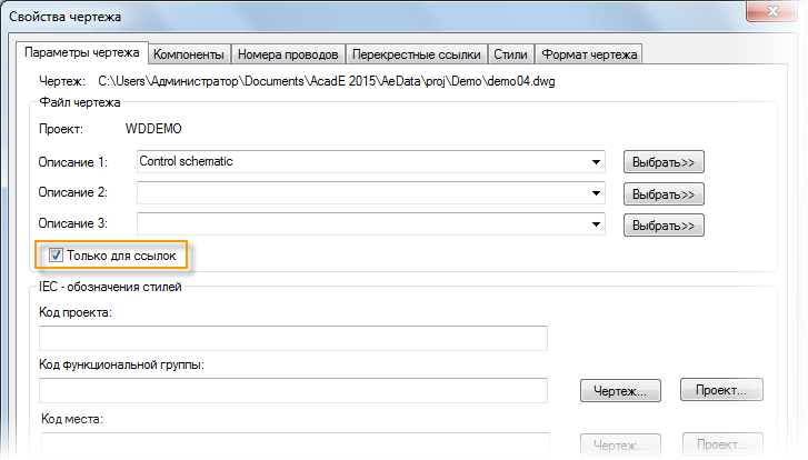 Возможно, имеются чертежи, являющиеся частью проекта, но которые не нужно обрабатывать при выполнении операций в рамках проекта. Возможно также, они не являются чертежами электрических систем, но необходимы для всего проекта. Можно установить эти чертежи как информационные в свойствах чертежа.