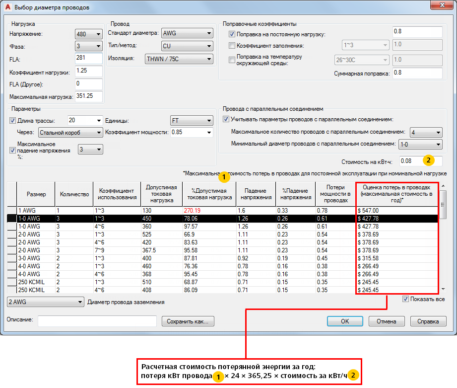 Указывает, отображаются ли варианты параллельного соединения проводов. Если этот флажок установлен, отображаются записи, предусматривающие наличие двух или более проводников меньшего диаметра для каждой фазы с учетом требований допустимой токовой нагрузки. |