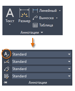 Как и в случае с другими элементами аннотаций, многострочный текст содержит множество параметров. Эти параметры можно сохранить в формате стиля текста с помощью команды СТИЛЬ, а затем к сохраненным стилям текста можно получить доступ, щелкнув стрелку раскрывающегося списка на панели "Аннотации". Текущий стиль текста отображается в верхней части раскрывающегося списка.