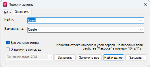 Отобразится сообщение с подробной информацией о местонахождении команды, ее точном положении на панели "Адаптации" или "Свойства", а также о количестве вхождений команды.
