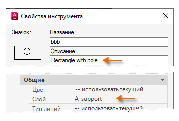 Введите описание, например Прямоугольник с X для aaa и Прямоугольник с отверстием для bbb. Описания появляются в качестве всплывающих подсказок.