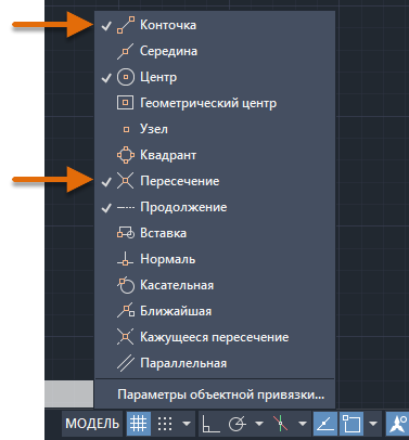 Щелкните правой кнопкой мыши кнопку «Объектная привязка» и установите флажки «Конечная точка» и «Пересечение», если они еще не выбраны.