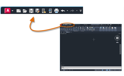 В верхней части окна AutoCAD есть стандартная лента вкладок. На вкладке "Главная" можно получить доступ практически ко всем командам, представленным в этом руководстве. Кроме того, на панели быстрого доступа, показанной на иллюстрации ниже, есть значки популярных команд, таких как «Создать», «Открыть», «Сохранить», «Печать» и «Отменить».