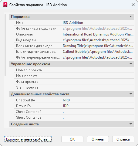 К такой информации относятся путь и имя файла данных подшивки (DST), пути к папкам, содержащим файлы чертежей, относящихся к подшивке, и другие пользовательские свойства подшивки