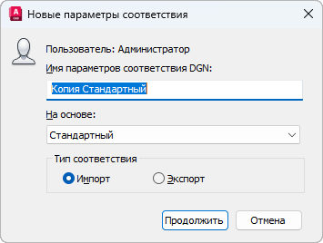 Вызов диалогового окна "Изменить параметр соответствия DGN". В зависимости от выбранного типа соответствия (импорт или экспорт) отображается диалоговое окно импорта или экспорта.