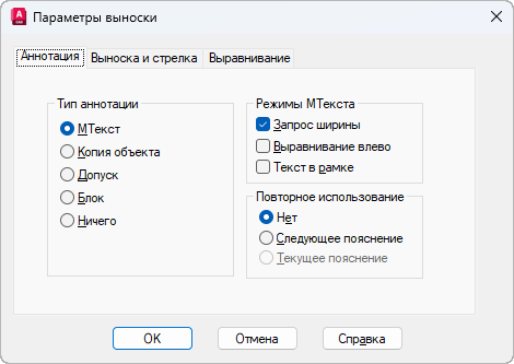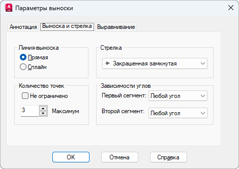 Диалоговое окно "Параметры выноски" состоит из следующих вкладок: "Аннотация", "Линия выноски и стрелка", "Выравнивание".