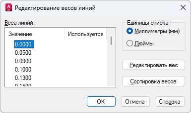 Список весов линий, входящих в таблицу стилей печати. Пользователь может изменять имеющиеся веса линий, но не может добавлять и удалять веса. Изменение значения веса линий в списке воздействует на все стили печати, где он используется.