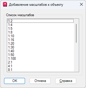 Вывод списка масштабов, которые можно добавить к выбранному аннотативному объекту.