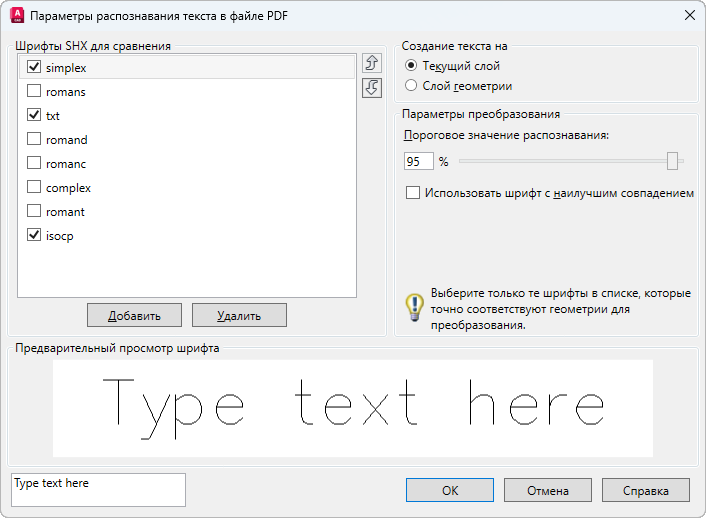 Добавление шрифта SHX в список для сравнения.