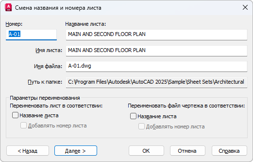 Загрузка данных о следующем листе в диалоговое окно. Данная кнопка облегчает операцию задания нового названия и номера сразу нескольким листам.