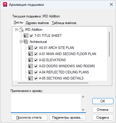 Список листов, включаемых в пакет архива, в том порядке, в котором они были созданы, и в соответствии со структурой группы. Подшивка должна быть открыта в "Диспетчере подшивок". Архивация может быть инициирована либо из контекстного меню, если правой кнопкой мыши щелкнуть элемент подшивки верхнего уровня, либо путем ввода в командной строке команды АРХИВАЦИЯ.