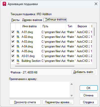 Список файлов, включаемых в упаковку архива, в виде таблицы. По умолчанию сюда заносятся все файлы, на которые ссылается текущий чертеж (такие как внешние ссылки, стили печати и шрифты). Пользователь может добавить файлы в упаковку архива или удалить существующие файлы из него. В архив не включаются файлы, ссылки на которые установлены посредством URL.
