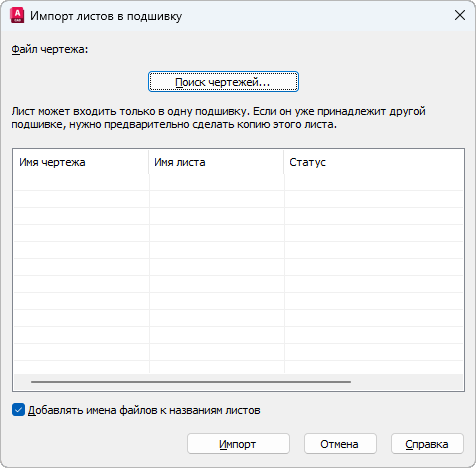 Диалоговое окно "Импорт листов в подшивку"