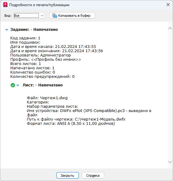 Отображение информации о задачах печати и публикации, выполненных в текущем сеансе.