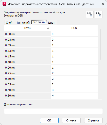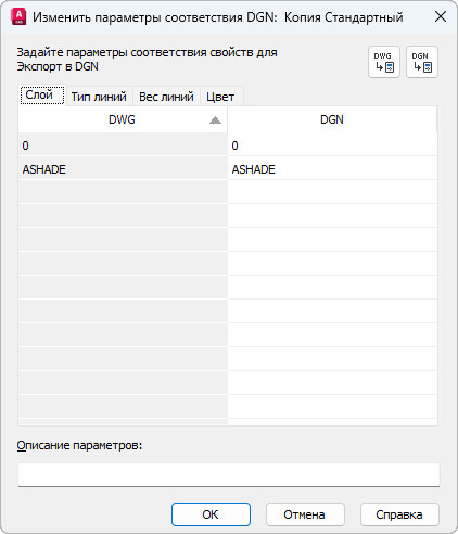 Параметры соответствия для экспорта: Если диалоговое окно "Изменить параметры соответствия DGN" вызвано путем создания нового набора параметров соответствия в диалоговом окне "Параметры экспорта в DGN", в столбце "DWG" содержатся все типы линий, определенные в текущем чертеже. Если ячейка назначения пустая (правый столбец), используется заданное по умолчанию значение соответствия системы.