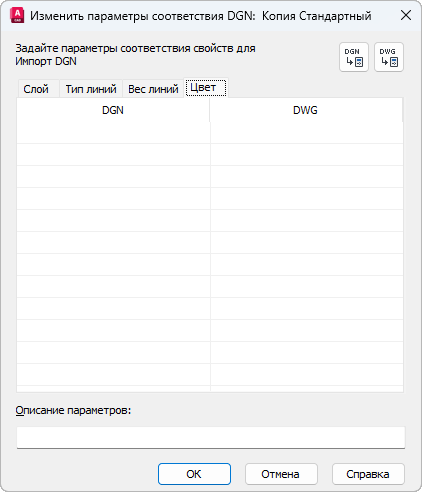 Диалоговое окно "Изменить параметры соответствия DGN" содержит следующие вкладки: