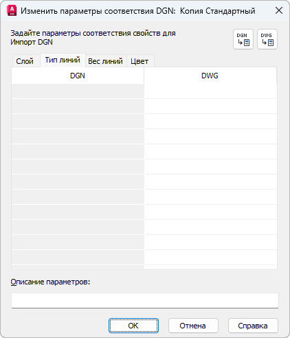 Импорт параметров соответствия: Если диалоговое окно "Изменить параметры соответствия DGN" вызвано при создании нового набора параметров соответствия в диалоговом окне "Параметры импорта DGN", в столбце "DGN" содержатся все типы линий, определенные в импортируемом файле DGN, а также определенные в файле-прототипе DGN на момент создания файла DGN.