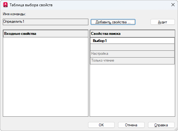 Диалоговое окно "Таблица выбора свойств"