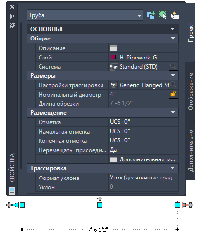 Точное моделирование длины сегмента трубы выполняется с помощью отдельных стыков. Имеющийся в палитре свойств параметр "Длина обрезки" соответствует фактической длине трубы и включает глубину, которая требуется для зацепления фланцев.