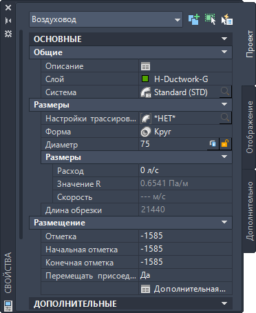 Изменение основных свойств воздуховода с помощью палитры "Свойства".