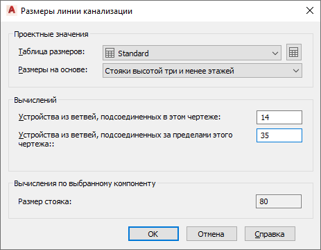 Если определение размеров было основано на стояках, диалоговое окно "Размеры линии канализации" отображает результаты определения размеров для имеющихся в чертеже стояков.