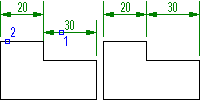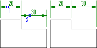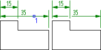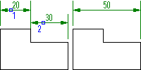 Команда AMDIMALIGN применяется для взаимного выравнивания размеров, аналогично размерной цепи. На предыдущей иллюстрации показано, как один размер выбран в качестве базового (1), а другой (2) выровнен относительно первого. Предусмотрено выравнивание угловых и линейных размеров.