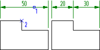 Команда AMDIMJOIN служит для соединения двух расположенных рядом размеров в один размер. На предыдущей иллюстрации показано, как один размер выбран в качестве базового (1), а другой (2) присоединен к нему.