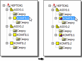 Пример чертежа, который содержит два вхождения сборки "УЗЕЛ 1"; "УЗЕЛ1:1" и "УЗЕЛ1:2". КОМП1 присутствует как в элементе УЗЕЛ1 (КОМП1:2), так и вне его (КОМП1:1). Если выбрать КОМП1:2 в элемент УЗЕЛ1:1 и сделать его ссылочным компонентом, КОМП1:2 в элементе УЗЕЛ1:2 также становится ссылочным компонентом. Это происходит потому, что элемент КОМП1:2 присутствует в двух местах: в элементе УЗЕЛ1:1 и в элементе УЗЕЛ1:2. При этом экземпляр КОМП1:1 не становится ссылочным компонентом.