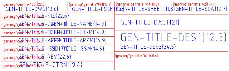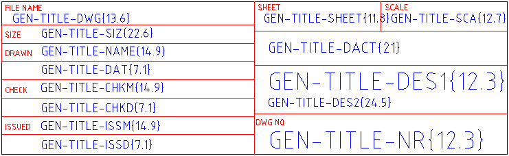 Записи основной надписи представлены в виде атрибутов. Как правило, они имеют вид GEN-TITLE-SOMENAME {12.3}, где