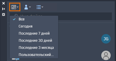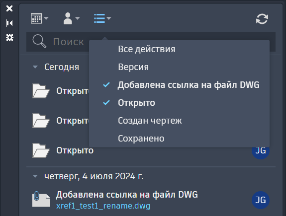 Если в чертежах зарегистрировано много действий, можно отфильтровать их на палитре, чтобы просмотреть конкретные действия для определенного чертежа. Например, может потребоваться просмотреть действия в определенном диапазоне времени, только ваши действия или конкретные типы действий.